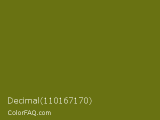 Decimal 110167170 Color is a dark yellow color and the nearest color is Olivetone #716e10. Hex code #697212 and RGB value is rgb(105,114,18). In RGB color space, this color is composed of 41% red, 45% green, 7% blue, In CMYK color space, this color is composed of 8% cyan, 0% magenta, 84% yellow , 55% black , In HSL color space, this color has a hue angle of 66° , 73% saturation and 26% lightness.