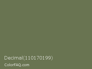 Decimal 110170199 Color is a normal lime color and the nearest color is Kokoda #6e6d57. Hex code #697451 and RGB value is rgb(105,116,81). In RGB color space, this color is composed of 41% red, 45% green, 32% blue, In CMYK color space, this color is composed of 9% cyan, 0% magenta, 30% yellow , 55% black , In HSL color space, this color has a hue angle of 79° , 18% saturation and 39% lightness.