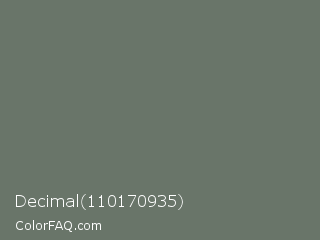 Decimal 110170935 Color is a normal green color and the nearest color is Dove Gray #6d6c6c. Hex code #697569 and RGB value is rgb(105,117,105). In RGB color space, this color is composed of 41% red, 46% green, 41% blue, In CMYK color space, this color is composed of 10% cyan, 0% magenta, 10% yellow , 54% black , In HSL color space, this color has a hue angle of 120° , 5% saturation and 44% lightness.