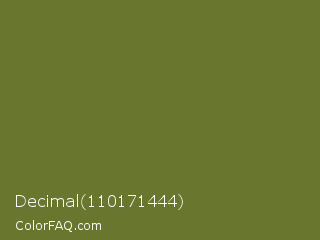 Decimal 110171444 Color is a normal lime color and the nearest color is Crete #737829. Hex code #69762e and RGB value is rgb(105,118,46). In RGB color space, this color is composed of 41% red, 46% green, 18% blue, In CMYK color space, this color is composed of 11% cyan, 0% magenta, 61% yellow , 54% black , In HSL color space, this color has a hue angle of 71° , 44% saturation and 32% lightness.