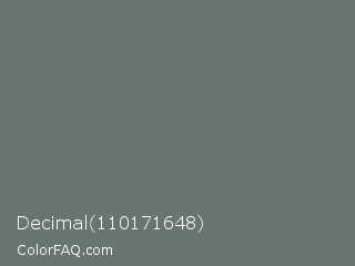 Decimal 110171648 Color is a normal green color and the nearest color is Nickel #727472. Hex code #697670 and RGB value is rgb(105,118,112). In RGB color space, this color is composed of 41% red, 46% green, 44% blue, In CMYK color space, this color is composed of 11% cyan, 0% magenta, 5% yellow , 54% black , In HSL color space, this color has a hue angle of 152° , 6% saturation and 44% lightness.