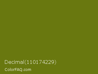 Decimal 110174229 Color is a dark yellow color and the nearest color is Olivetone #716e10. Hex code #69780f and RGB value is rgb(105,120,15). In RGB color space, this color is composed of 41% red, 47% green, 6% blue, In CMYK color space, this color is composed of 13% cyan, 0% magenta, 88% yellow , 53% black , In HSL color space, this color has a hue angle of 69° , 78% saturation and 26% lightness.