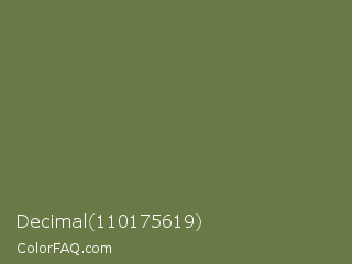 Decimal 110175619 Color is a normal green color and the nearest color is Dingley #5d7747. Hex code #697a47 and RGB value is rgb(105,122,71). In RGB color space, this color is composed of 41% red, 48% green, 28% blue, In CMYK color space, this color is composed of 14% cyan, 0% magenta, 42% yellow , 52% black , In HSL color space, this color has a hue angle of 80° , 26% saturation and 38% lightness.