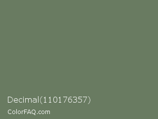 Decimal 110176357 Color is a normal green color and the nearest color is Willow Grove #65745d. Hex code #697b61 and RGB value is rgb(105,123,97). In RGB color space, this color is composed of 41% red, 48% green, 38% blue, In CMYK color space, this color is composed of 15% cyan, 0% magenta, 21% yellow , 52% black , In HSL color space, this color has a hue angle of 102° , 12% saturation and 43% lightness.