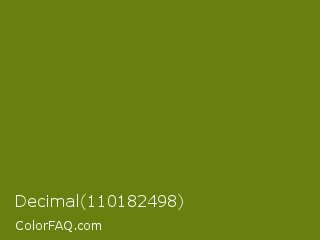 Decimal 110182498 Color is a dark lime color and the nearest color is Olivetone #716e10. Hex code #69800e and RGB value is rgb(105,128,14). In RGB color space, this color is composed of 41% red, 50% green, 5% blue, In CMYK color space, this color is composed of 18% cyan, 0% magenta, 89% yellow , 50% black , In HSL color space, this color has a hue angle of 72° , 80% saturation and 28% lightness.