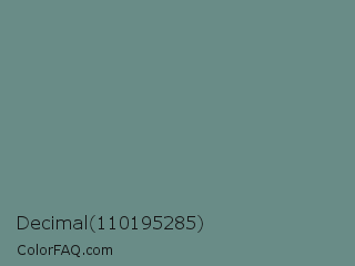 Decimal 110195285 Color is a normal cyan color and the nearest color is Steel Teal #5f8a8b. Hex code #698c87 and RGB value is rgb(105,140,135). In RGB color space, this color is composed of 41% red, 55% green, 53% blue, In CMYK color space, this color is composed of 25% cyan, 0% magenta, 4% yellow , 45% black , In HSL color space, this color has a hue angle of 171° , 14% saturation and 48% lightness.