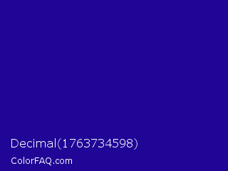Decimal 1763734598 Color is a dark indigo color and the nearest color is Ultramarine #120a8f. Hex code #200596 and RGB value is rgb(32,5,150). In RGB color space, this color is composed of 13% red, 2% green, 59% blue, In CMYK color space, this color is composed of 79% cyan, 97% magenta, 0% yellow , 41% black , In HSL color space, this color has a hue angle of 251° , 94% saturation and 30% lightness.