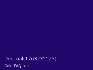 Decimal 1763735126 Color is a very dark indigo color and the nearest color is Paris M #26056a. Hex code #200668 and RGB value is rgb(32,6,104). In RGB color space, this color is composed of 13% red, 2% green, 41% blue, In CMYK color space, this color is composed of 69% cyan, 94% magenta, 0% yellow , 59% black , In HSL color space, this color has a hue angle of 256° , 89% saturation and 22% lightness.