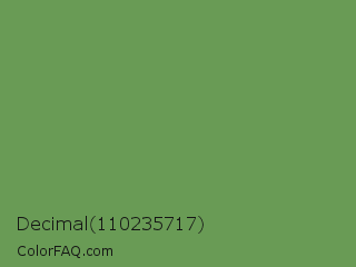 Decimal 110235717 Color is a normal green color and the nearest color is Asparagus Green #7ba05b. Hex code #699b55 and RGB value is rgb(105,155,85). In RGB color space, this color is composed of 41% red, 61% green, 33% blue, In CMYK color space, this color is composed of 32% cyan, 0% magenta, 45% yellow , 39% black , In HSL color space, this color has a hue angle of 103° , 29% saturation and 47% lightness.