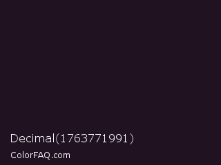 Decimal 1763771991 Color is a very dark magenta color and the nearest color is Eerie Black #1b1b1b. Hex code #201221 and RGB value is rgb(32,18,33). In RGB color space, this color is composed of 13% red, 7% green, 13% blue, In CMYK color space, this color is composed of 3% cyan, 45% magenta, 0% yellow , 87% black , In HSL color space, this color has a hue angle of 296° , 29% saturation and 10% lightness.