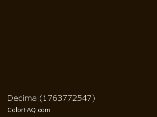 Decimal 1763772547 Color is a almost black orange color and the nearest color is Creole #1e0f04. Hex code #201303 and RGB value is rgb(32,19,3). In RGB color space, this color is composed of 13% red, 7% green, 1% blue, In CMYK color space, this color is composed of 0% cyan, 41% magenta, 91% yellow , 87% black , In HSL color space, this color has a hue angle of 33° , 83% saturation and 7% lightness.