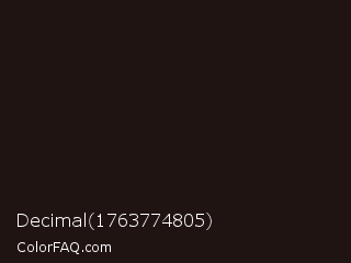 Decimal 1763774805 Color is a very dark red color and the nearest color is Night Rider #1f120f. Hex code #201413 and RGB value is rgb(32,20,19). In RGB color space, this color is composed of 13% red, 8% green, 7% blue, In CMYK color space, this color is composed of 0% cyan, 38% magenta, 41% yellow , 87% black , In HSL color space, this color has a hue angle of 5° , 25% saturation and 10% lightness.
