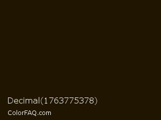 Decimal 1763775378 Color is a almost black orange color and the nearest color is Acadia #1b1404. Hex code #201500 and RGB value is rgb(32,21,0). In RGB color space, this color is composed of 13% red, 8% green, 0% blue, In CMYK color space, this color is composed of 0% cyan, 34% magenta, 100% yellow , 87% black , In HSL color space, this color has a hue angle of 39° , 100% saturation and 6% lightness.