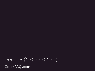 Decimal 1763776130 Color is a very dark purple color and the nearest color is Eerie Black #1b1b1b. Hex code #201622 and RGB value is rgb(32,22,34). In RGB color space, this color is composed of 13% red, 9% green, 13% blue, In CMYK color space, this color is composed of 6% cyan, 35% magenta, 0% yellow , 87% black , In HSL color space, this color has a hue angle of 290° , 21% saturation and 11% lightness.