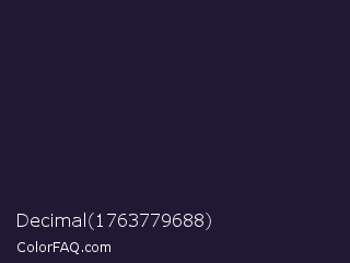 Decimal 1763779688 Color is a very dark indigo color and the nearest color is Haiti #1b1035. Hex code #201934 and RGB value is rgb(32,25,52). In RGB color space, this color is composed of 13% red, 10% green, 20% blue, In CMYK color space, this color is composed of 38% cyan, 52% magenta, 0% yellow , 80% black , In HSL color space, this color has a hue angle of 256° , 35% saturation and 15% lightness.