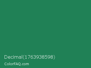 Decimal 1763938598 Color is a normal green color and the nearest color is Eucalyptus #278a5b. Hex code #208156 and RGB value is rgb(32,129,86). In RGB color space, this color is composed of 13% red, 51% green, 34% blue, In CMYK color space, this color is composed of 75% cyan, 0% magenta, 33% yellow , 49% black , In HSL color space, this color has a hue angle of 153° , 60% saturation and 32% lightness.