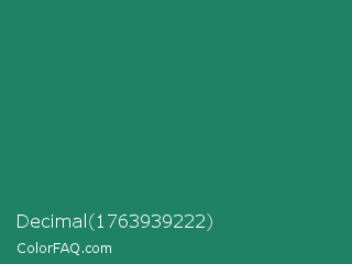 Decimal 1763939222 Color is a normal green color and the nearest color is Eucalyptus #278a5b. Hex code #208264 and RGB value is rgb(32,130,100). In RGB color space, this color is composed of 13% red, 51% green, 39% blue, In CMYK color space, this color is composed of 75% cyan, 0% magenta, 23% yellow , 49% black , In HSL color space, this color has a hue angle of 162° , 60% saturation and 32% lightness.