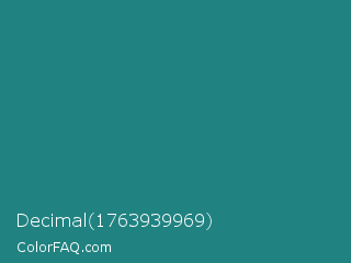 Decimal 1763939969 Color is a normal cyan color and the nearest color is Elm #1c7c7d. Hex code #208381 and RGB value is rgb(32,131,129). In RGB color space, this color is composed of 13% red, 51% green, 51% blue, In CMYK color space, this color is composed of 76% cyan, 0% magenta, 2% yellow , 49% black , In HSL color space, this color has a hue angle of 179° , 61% saturation and 32% lightness.