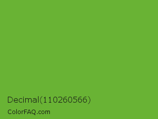 Decimal 110260566 Color is a normal green color and the nearest color is Green RYB #66b032. Hex code #69b334 and RGB value is rgb(105,179,52). In RGB color space, this color is composed of 41% red, 70% green, 20% blue, In CMYK color space, this color is composed of 41% cyan, 0% magenta, 71% yellow , 30% black , In HSL color space, this color has a hue angle of 95° , 55% saturation and 45% lightness.