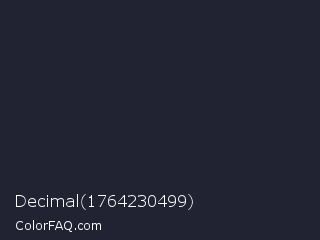 Decimal 1764230499 Color is a very dark blue color and the nearest color is Steel Gray #262335. Hex code #212333 and RGB value is rgb(33,35,51). In RGB color space, this color is composed of 13% red, 14% green, 20% blue, In CMYK color space, this color is composed of 35% cyan, 31% magenta, 0% yellow , 80% black , In HSL color space, this color has a hue angle of 233° , 21% saturation and 16% lightness.