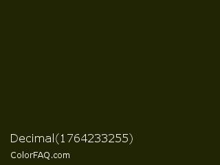Decimal 1764233255 Color is a almost black yellow color and the nearest color is Pine Tree #171f04. Hex code #212503 and RGB value is rgb(33,37,3). In RGB color space, this color is composed of 13% red, 15% green, 1% blue, In CMYK color space, this color is composed of 11% cyan, 0% magenta, 92% yellow , 85% black , In HSL color space, this color has a hue angle of 67° , 85% saturation and 8% lightness.