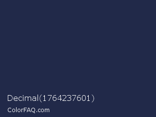 Decimal 1764237601 Color is a very dark blue color and the nearest color is Space Cadet #1d2951. Hex code #212949 and RGB value is rgb(33,41,73). In RGB color space, this color is composed of 13% red, 16% green, 29% blue, In CMYK color space, this color is composed of 55% cyan, 44% magenta, 0% yellow , 71% black , In HSL color space, this color has a hue angle of 228° , 38% saturation and 21% lightness.