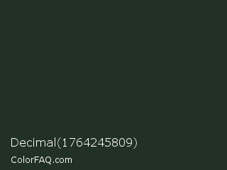 Decimal 1764245809 Color is a very dark green color and the nearest color is Green Kelp #25311c. Hex code #213123 and RGB value is rgb(33,49,35). In RGB color space, this color is composed of 13% red, 19% green, 14% blue, In CMYK color space, this color is composed of 33% cyan, 0% magenta, 29% yellow , 81% black , In HSL color space, this color has a hue angle of 128° , 20% saturation and 16% lightness.