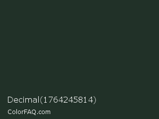 Decimal 1764245814 Color is a very dark green color and the nearest color is Black Leather Jacket #253529. Hex code #213128 and RGB value is rgb(33,49,40). In RGB color space, this color is composed of 13% red, 19% green, 16% blue, In CMYK color space, this color is composed of 33% cyan, 0% magenta, 18% yellow , 81% black , In HSL color space, this color has a hue angle of 146° , 20% saturation and 16% lightness.