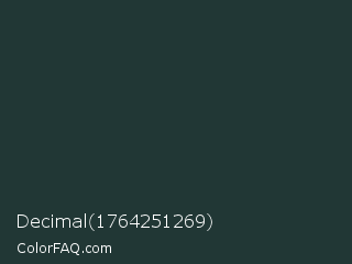 Decimal 1764251269 Color is a very dark cyan color and the nearest color is Medium Jungle Green #1c352d. Hex code #213735 and RGB value is rgb(33,55,53). In RGB color space, this color is composed of 13% red, 22% green, 21% blue, In CMYK color space, this color is composed of 40% cyan, 0% magenta, 4% yellow , 78% black , In HSL color space, this color has a hue angle of 175° , 25% saturation and 17% lightness.