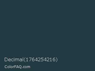 Decimal 1764254216 Color is a very dark blue color and the nearest color is Te Papa Green #1e433c. Hex code #213940 and RGB value is rgb(33,57,64). In RGB color space, this color is composed of 13% red, 22% green, 25% blue, In CMYK color space, this color is composed of 48% cyan, 11% magenta, 0% yellow , 75% black , In HSL color space, this color has a hue angle of 194° , 32% saturation and 19% lightness.