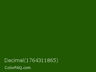 Decimal 1764311865 Color is a very dark green color and the nearest color is Lincoln Green #195905. Hex code #215903 and RGB value is rgb(33,89,3). In RGB color space, this color is composed of 13% red, 35% green, 1% blue, In CMYK color space, this color is composed of 63% cyan, 0% magenta, 97% yellow , 65% black , In HSL color space, this color has a hue angle of 99° , 93% saturation and 18% lightness.