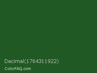 Decimal 1764311922 Color is a dark green color and the nearest color is Cal Poly Pomona Green #1e4d2b. Hex code #215924 and RGB value is rgb(33,89,36). In RGB color space, this color is composed of 13% red, 35% green, 14% blue, In CMYK color space, this color is composed of 63% cyan, 0% magenta, 60% yellow , 65% black , In HSL color space, this color has a hue angle of 123° , 46% saturation and 24% lightness.
