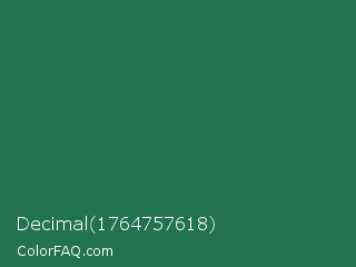Decimal 1764757618 Color is a dark green color and the nearest color is Dark Spring Green #177245. Hex code #217350 and RGB value is rgb(33,115,80). In RGB color space, this color is composed of 13% red, 45% green, 31% blue, In CMYK color space, this color is composed of 71% cyan, 0% magenta, 30% yellow , 55% black , In HSL color space, this color has a hue angle of 154° , 55% saturation and 29% lightness.