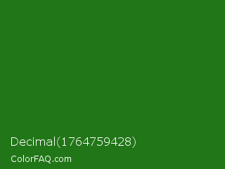 Decimal 1764759428 Color is a dark green color and the nearest color is Bilbao #327c14. Hex code #217618 and RGB value is rgb(33,118,24). In RGB color space, this color is composed of 13% red, 46% green, 9% blue, In CMYK color space, this color is composed of 72% cyan, 0% magenta, 80% yellow , 54% black , In HSL color space, this color has a hue angle of 114° , 66% saturation and 28% lightness.