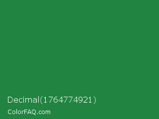Decimal 1764774921 Color is a normal green color and the nearest color is Dark Spring Green #177245. Hex code #218441 and RGB value is rgb(33,132,65). In RGB color space, this color is composed of 13% red, 52% green, 25% blue, In CMYK color space, this color is composed of 75% cyan, 0% magenta, 51% yellow , 48% black , In HSL color space, this color has a hue angle of 139° , 60% saturation and 32% lightness.