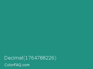Decimal 1764788226 Color is a normal cyan color and the nearest color is Lochinvar #2c8c84. Hex code #219182 and RGB value is rgb(33,145,130). In RGB color space, this color is composed of 13% red, 57% green, 51% blue, In CMYK color space, this color is composed of 77% cyan, 0% magenta, 10% yellow , 43% black , In HSL color space, this color has a hue angle of 172° , 63% saturation and 35% lightness.