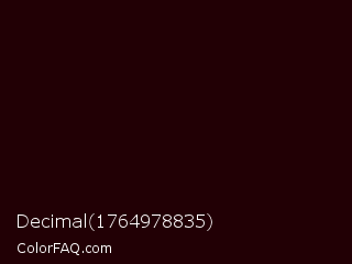 Decimal 1764978835 Color is a almost black red color and the nearest color is Sepia Black #2b0202. Hex code #220005 and RGB value is rgb(34,0,5). In RGB color space, this color is composed of 13% red, 0% green, 2% blue, In CMYK color space, this color is composed of 0% cyan, 100% magenta, 85% yellow , 87% black , In HSL color space, this color has a hue angle of 351° , 100% saturation and 7% lightness.