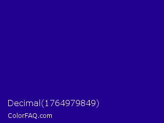 Decimal 1764979849 Color is a dark indigo color and the nearest color is Blue Gem #2c0e8c. Hex code #220191 and RGB value is rgb(34,1,145). In RGB color space, this color is composed of 13% red, 0% green, 57% blue, In CMYK color space, this color is composed of 77% cyan, 99% magenta, 0% yellow , 43% black , In HSL color space, this color has a hue angle of 254° , 99% saturation and 29% lightness.