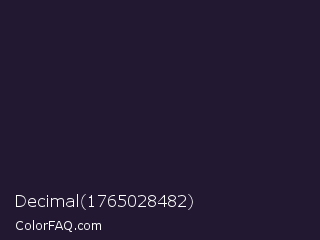 Decimal 1765028482 Color is a very dark violet color and the nearest color is Revolver #2c1632. Hex code #221832 and RGB value is rgb(34,24,50). In RGB color space, this color is composed of 13% red, 9% green, 20% blue, In CMYK color space, this color is composed of 32% cyan, 52% magenta, 0% yellow , 80% black , In HSL color space, this color has a hue angle of 263° , 35% saturation and 15% lightness.