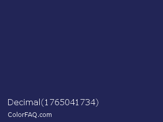 Decimal 1765041734 Color is a dark blue color and the nearest color is Space Cadet #1d2951. Hex code #222556 and RGB value is rgb(34,37,86). In RGB color space, this color is composed of 13% red, 15% green, 34% blue, In CMYK color space, this color is composed of 60% cyan, 57% magenta, 0% yellow , 66% black , In HSL color space, this color has a hue angle of 237° , 43% saturation and 24% lightness.