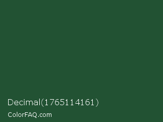 Decimal 1765114161 Color is a dark green color and the nearest color is Cal Poly Pomona Green #1e4d2b. Hex code #225233 and RGB value is rgb(34,82,51). In RGB color space, this color is composed of 13% red, 32% green, 20% blue, In CMYK color space, this color is composed of 59% cyan, 0% magenta, 38% yellow , 68% black , In HSL color space, this color has a hue angle of 141° , 41% saturation and 23% lightness.