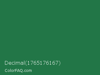 Decimal 1765176167 Color is a dark green color and the nearest color is Dark Spring Green #177245. Hex code #227647 and RGB value is rgb(34,118,71). In RGB color space, this color is composed of 13% red, 46% green, 28% blue, In CMYK color space, this color is composed of 71% cyan, 0% magenta, 40% yellow , 54% black , In HSL color space, this color has a hue angle of 146° , 55% saturation and 30% lightness.