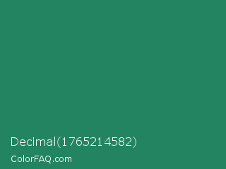 Decimal 1765214582 Color is a normal green color and the nearest color is Eucalyptus #278a5b. Hex code #228460 and RGB value is rgb(34,132,96). In RGB color space, this color is composed of 13% red, 52% green, 38% blue, In CMYK color space, this color is composed of 74% cyan, 0% magenta, 27% yellow , 48% black , In HSL color space, this color has a hue angle of 158° , 59% saturation and 33% lightness.