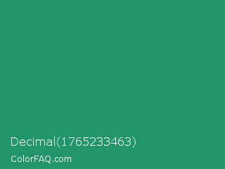 Decimal 1765233463 Color is a normal green color and the nearest color is Eucalyptus #278a5b. Hex code #229569 and RGB value is rgb(34,149,105). In RGB color space, this color is composed of 13% red, 58% green, 41% blue, In CMYK color space, this color is composed of 77% cyan, 0% magenta, 30% yellow , 42% black , In HSL color space, this color has a hue angle of 157° , 63% saturation and 36% lightness.