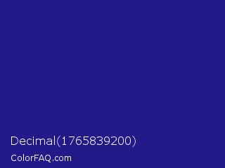Decimal 1765839200 Color is a normal indigo color and the nearest color is Jacksons Purple #20208d. Hex code #231988 and RGB value is rgb(35,25,136). In RGB color space, this color is composed of 14% red, 10% green, 53% blue, In CMYK color space, this color is composed of 74% cyan, 82% magenta, 0% yellow , 47% black , In HSL color space, this color has a hue angle of 245° , 69% saturation and 32% lightness.
