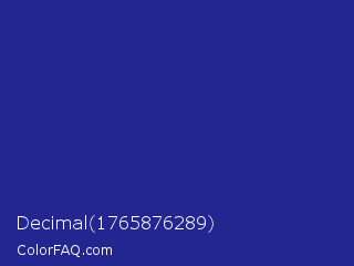 Decimal 1765876289 Color is a normal blue color and the nearest color is Jacksons Purple #20208d. Hex code #232591 and RGB value is rgb(35,37,145). In RGB color space, this color is composed of 14% red, 15% green, 57% blue, In CMYK color space, this color is composed of 76% cyan, 74% magenta, 0% yellow , 43% black , In HSL color space, this color has a hue angle of 239° , 61% saturation and 35% lightness.