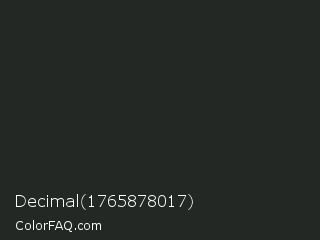 Decimal 1765878017 Color is a very dark green color and the nearest color is Dark Gunmetal #1f262a. Hex code #232825 and RGB value is rgb(35,40,37). In RGB color space, this color is composed of 14% red, 16% green, 15% blue, In CMYK color space, this color is composed of 13% cyan, 0% magenta, 8% yellow , 84% black , In HSL color space, this color has a hue angle of 144° , 7% saturation and 15% lightness.