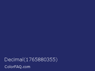 Decimal 1765880355 Color is a dark blue color and the nearest color is Biscay #1b3162. Hex code #232967 and RGB value is rgb(35,41,103). In RGB color space, this color is composed of 14% red, 16% green, 40% blue, In CMYK color space, this color is composed of 66% cyan, 60% magenta, 0% yellow , 60% black , In HSL color space, this color has a hue angle of 235° , 49% saturation and 27% lightness.