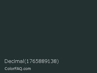 Decimal 1765889138 Color is a very dark cyan color and the nearest color is Black Leather Jacket #253529. Hex code #233230 and RGB value is rgb(35,50,48). In RGB color space, this color is composed of 14% red, 20% green, 19% blue, In CMYK color space, this color is composed of 30% cyan, 0% magenta, 4% yellow , 80% black , In HSL color space, this color has a hue angle of 172° , 18% saturation and 17% lightness.