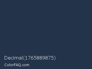 Decimal 1765889875 Color is a very dark blue color and the nearest color is Cloud Burst #202e54. Hex code #233349 and RGB value is rgb(35,51,73). In RGB color space, this color is composed of 14% red, 20% green, 29% blue, In CMYK color space, this color is composed of 52% cyan, 30% magenta, 0% yellow , 71% black , In HSL color space, this color has a hue angle of 215° , 35% saturation and 21% lightness.
